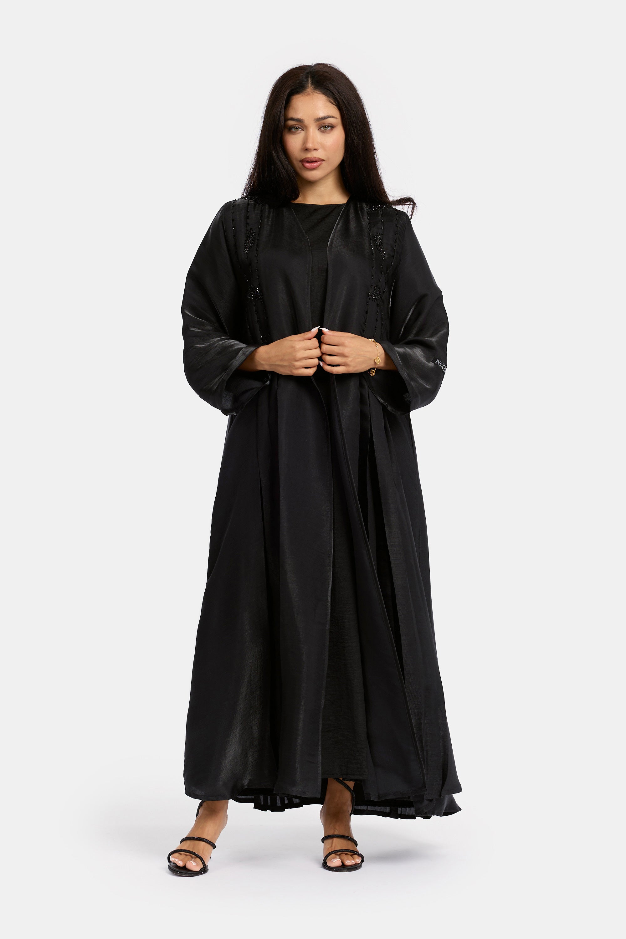 Step into timeless elegance with our Black Elegance Abaya, crafted from luxurious Rotana Shimmer fabric that exudes a soft, radiant glow. This beautifully flowing piece features a delicate ,understated sheen that adds a touch of sophistication to any look, making it perfect for both special occasions and elevated everyday wear. The design embraces a minimal yet refined aesthetic with a graceful drape and subtle embellishments along the back. Its neutral champagne hue complements all skin tones and can be effortlessly styled with your favorite accessories.
