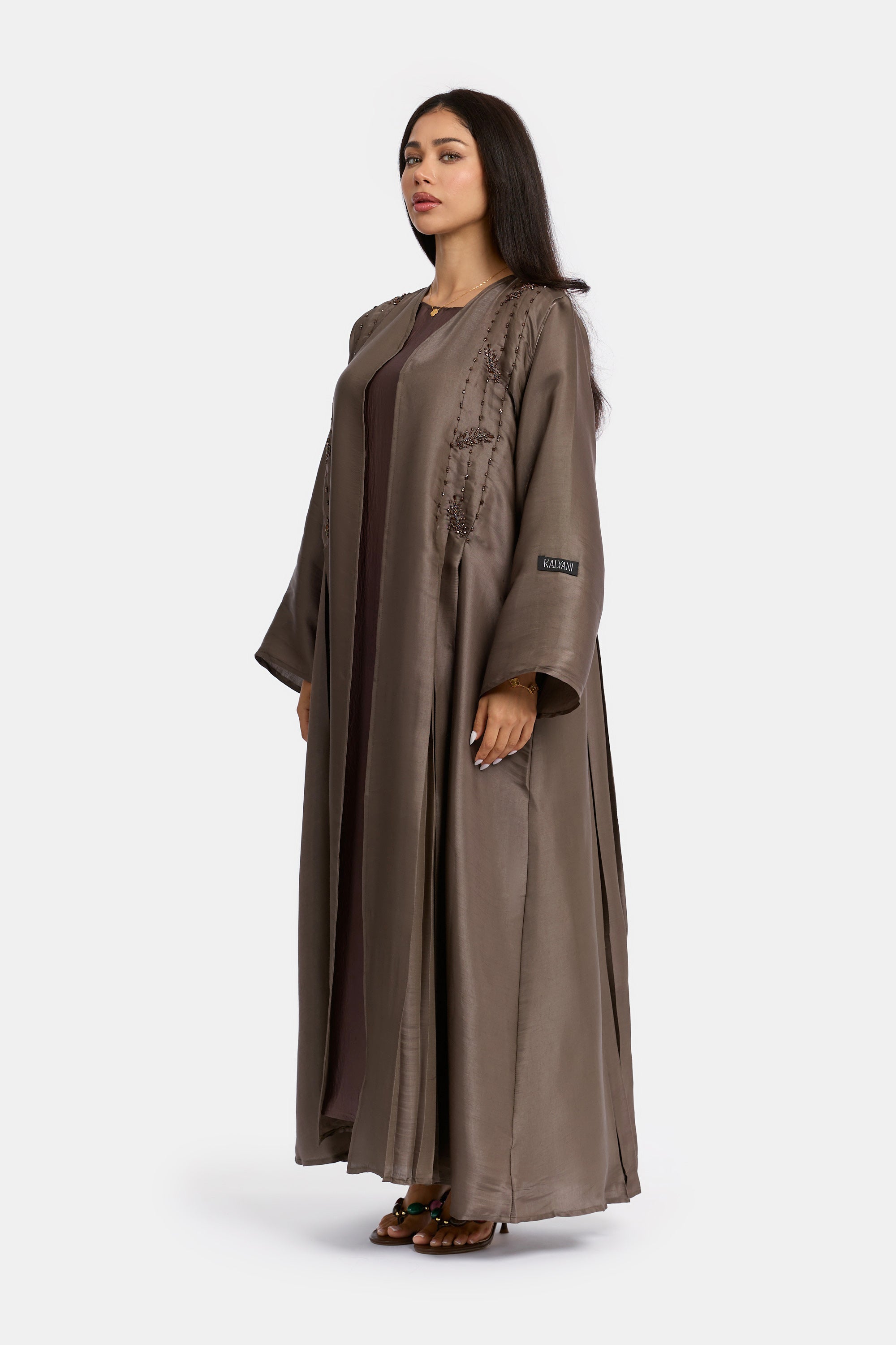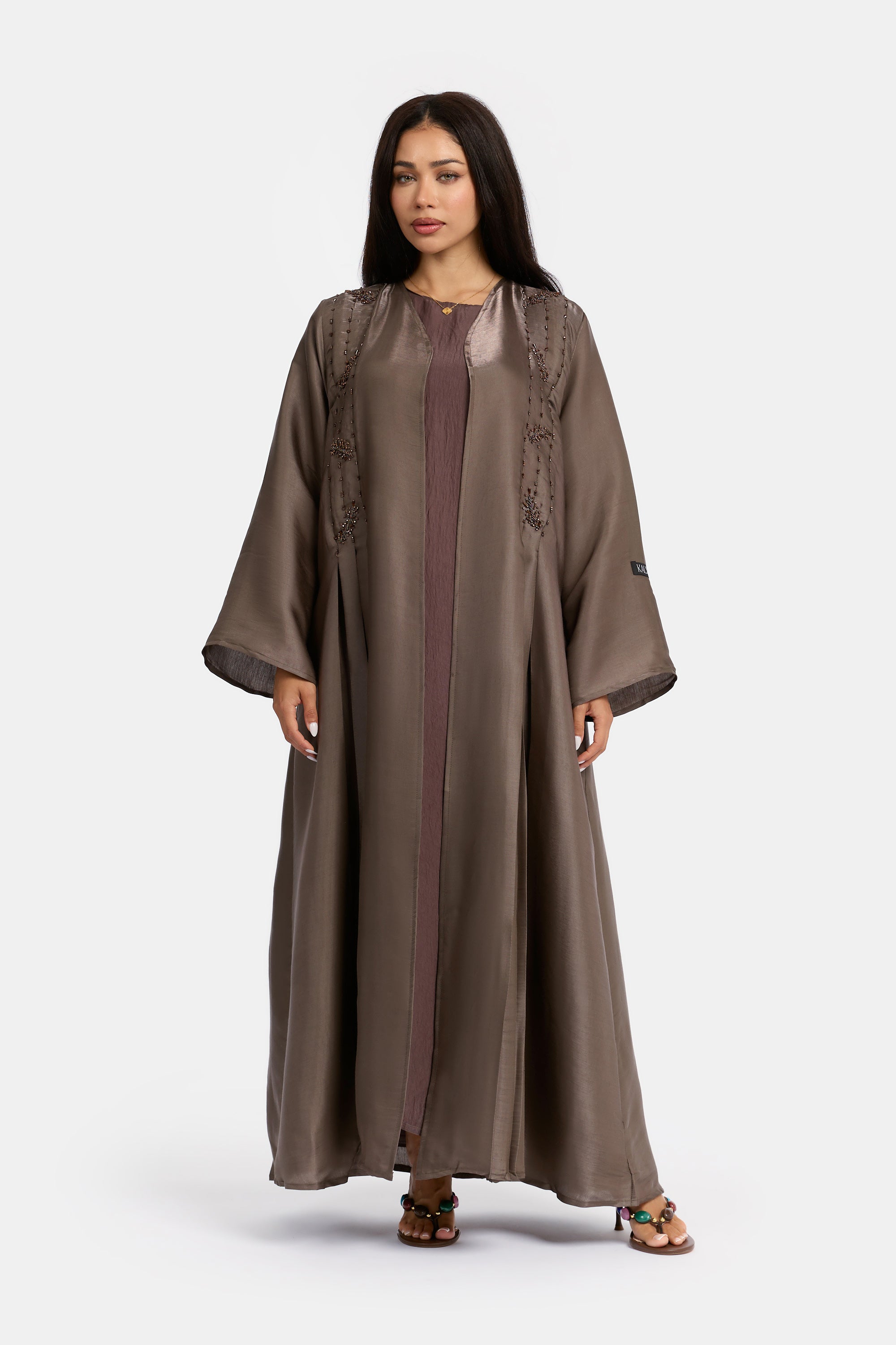 Embrace refined sophistication with our chestnut brown abaya, tailored from sumptuous Rotana Shimmer fabric that radiates a subtle, luminous glow. This flowing silhouette drapes gracefully, creating an effortlessly elegant look that transitions seamlessly from day to evening. The abaya is adorned with delicate, understated embellishments along the shoulders, adding a refined detail without compromising its timeless simplicity. Its rich chestnut brown hue captures the warmth of autumn while offering a modern, versatile tone that pairs beautifully with both gold and silver accents.